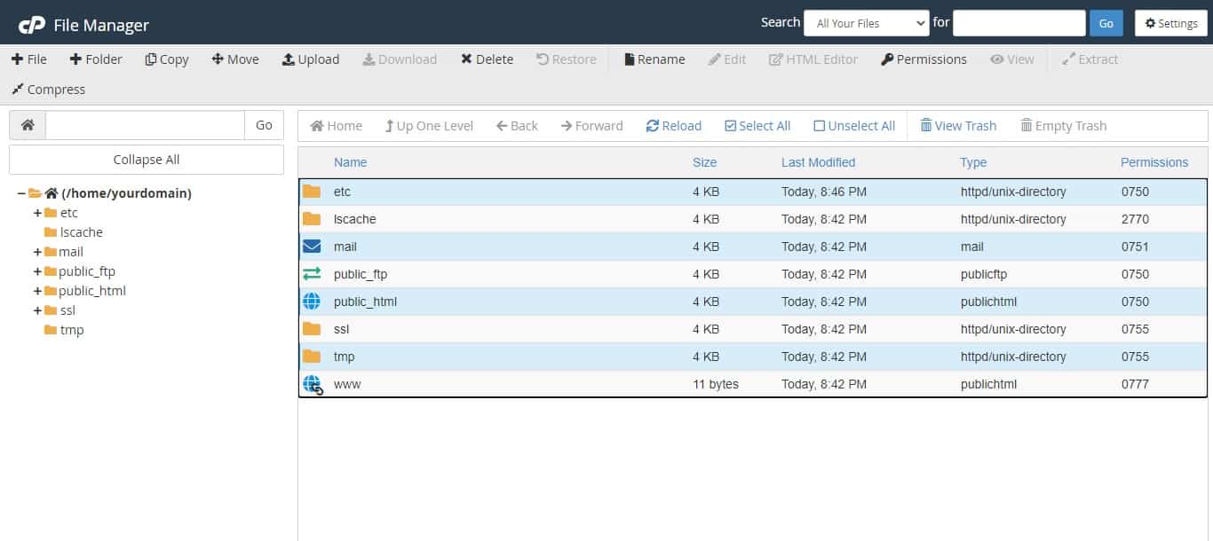 This is going to take you to the home directory. We can see a lot of really common folders here like public_html, bin, mail, etc. as shown below;